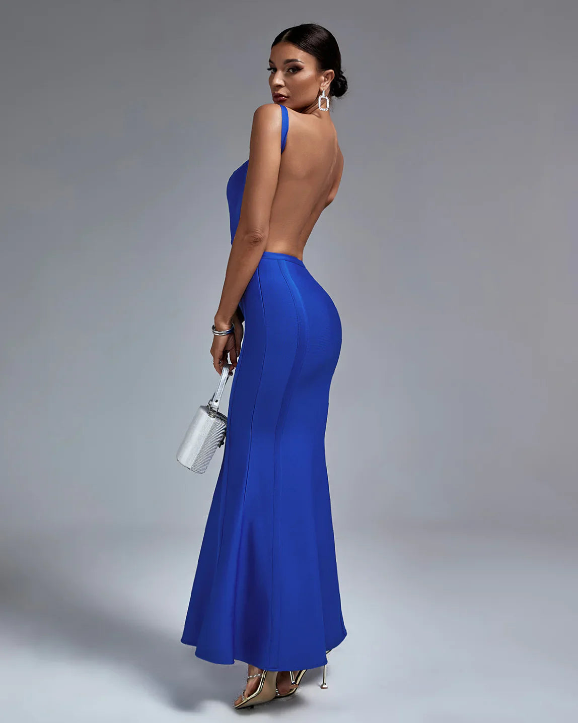 Command attention in a sculpting bandage gown with an open back and dramatic mermaid hem. The dense knit smooths and holds, delivering a sleek, high-impact silhouette ideal for formal nights. Tailored fit in bold blue, sizes XS-XL.