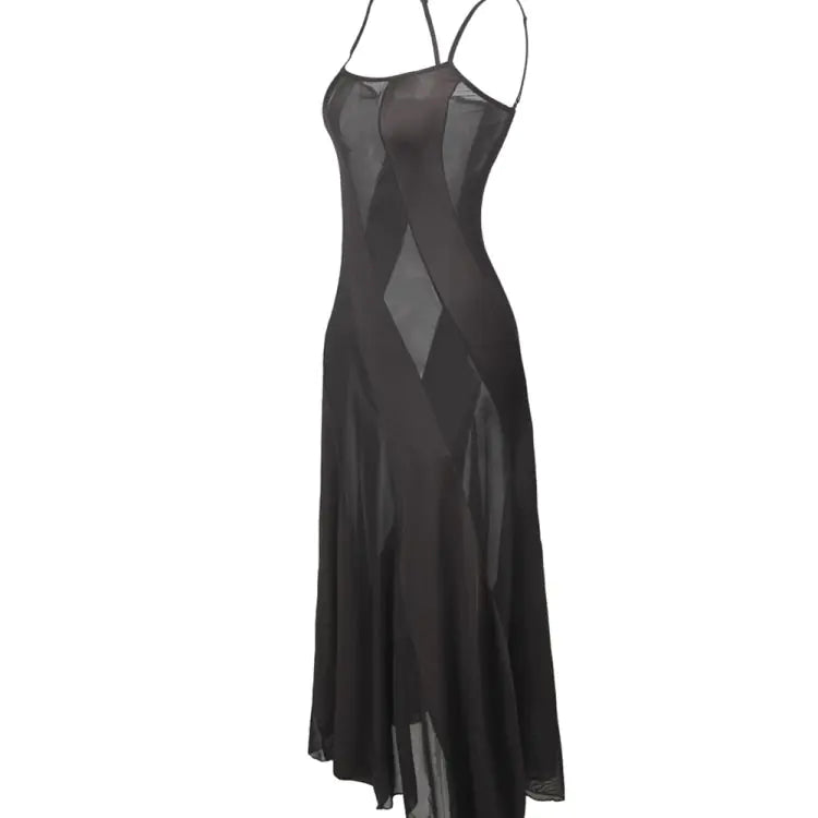 Chic black mesh lounge set with a sleeveless sling top and flowing long skirt for relaxed, elegant movement. Designed as a two-piece for easy styling from home hosting to slow evenings. Sizes S–6XL for every body.