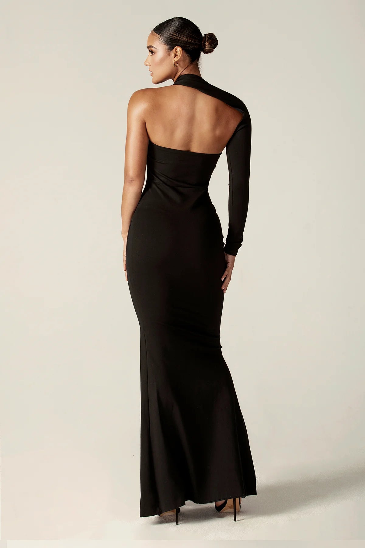Designed with European flair, this slim-fit maxi features an asymmetrical flowing skirt and chic diagonal neckline that frames the collar. Lightweight polyester ensures comfort with elegance, making it a perfect all-occasion dress. Offered in multiple colors, sizes S–L.
