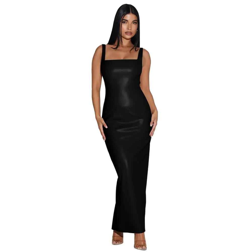 A head-turning faux-leather maxi with slim spaghetti straps and a sculpting, floor-length cut. The soft polyester-spandex-PU blend smooths and supports while highlighting curves. Perfect for upscale evenings or styled down with an oversized blazer.