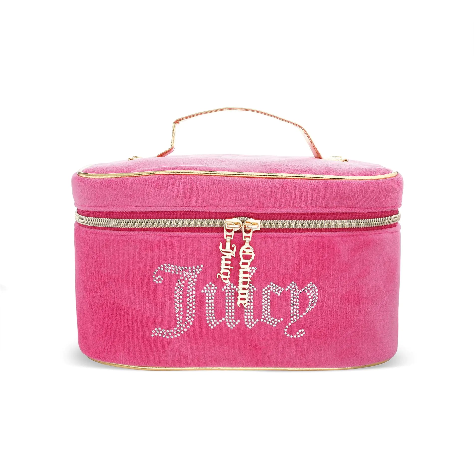 Stay stylishly organized with this Juicy Couture cosmetics train case, crafted in durable fabric with signature zipper pulls. Perfect as a travel makeup and toiletry organizer, it includes compartments to store skincare, brushes, cosmetics, and other essentials. A water-resistant wipe-clean lining makes it easy to maintain, while the included TSA-approved reusable bottle adds convenience for flights. Measuring 9.5” × 5.25” × 6”, it’s compact yet spacious. Finished with a sturdy top handle, this chic pink case is ideal for vacations, gym visits, or daily organization.