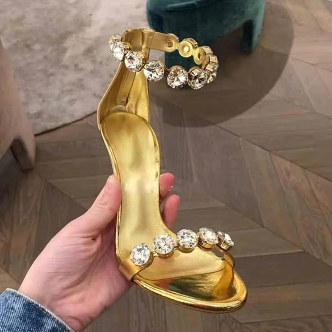 Make a bold summer statement with these rhinestone-studded open-toe stilettos. With a 6cm heel and non-slip sole, they provide height and comfort. Crafted from luxe microfiber in metallic gold, the breathable design and buckle strap keep your foot secure. Ideal for weddings, nights out, or upscale casual fits. Available in sizes 34–40.