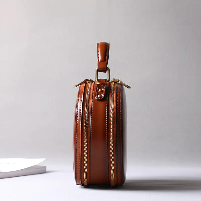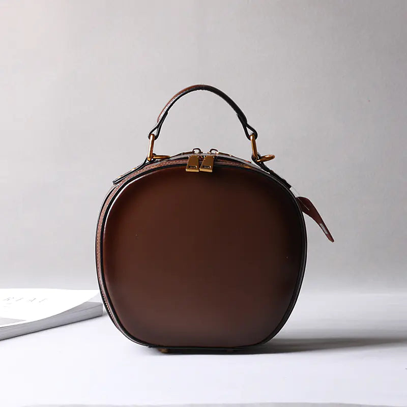 Chic round leather crossbody with two-layer construction and removable handle. Compact yet practical at 21.5×19.5×9 cm; light carry with standout shape. Colors: Wine Red, Green, Black, Khaki—pairs effortlessly from day to evening.