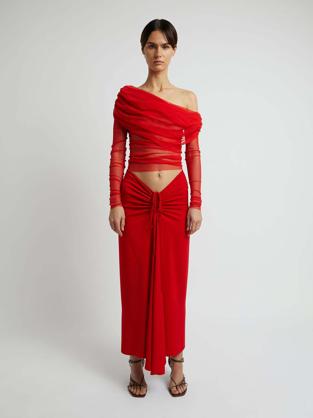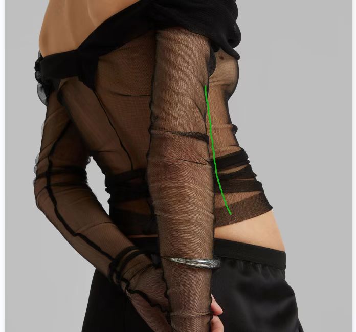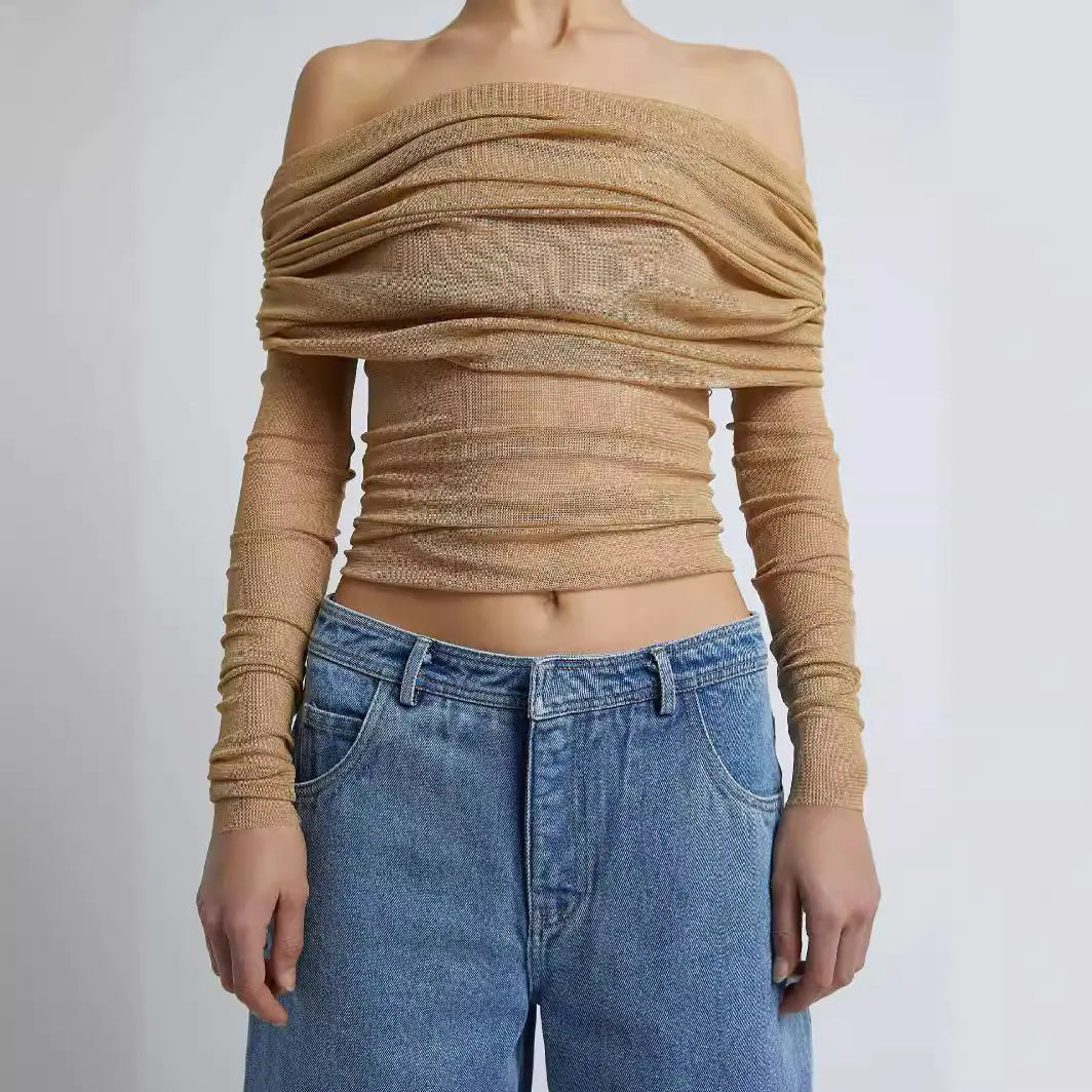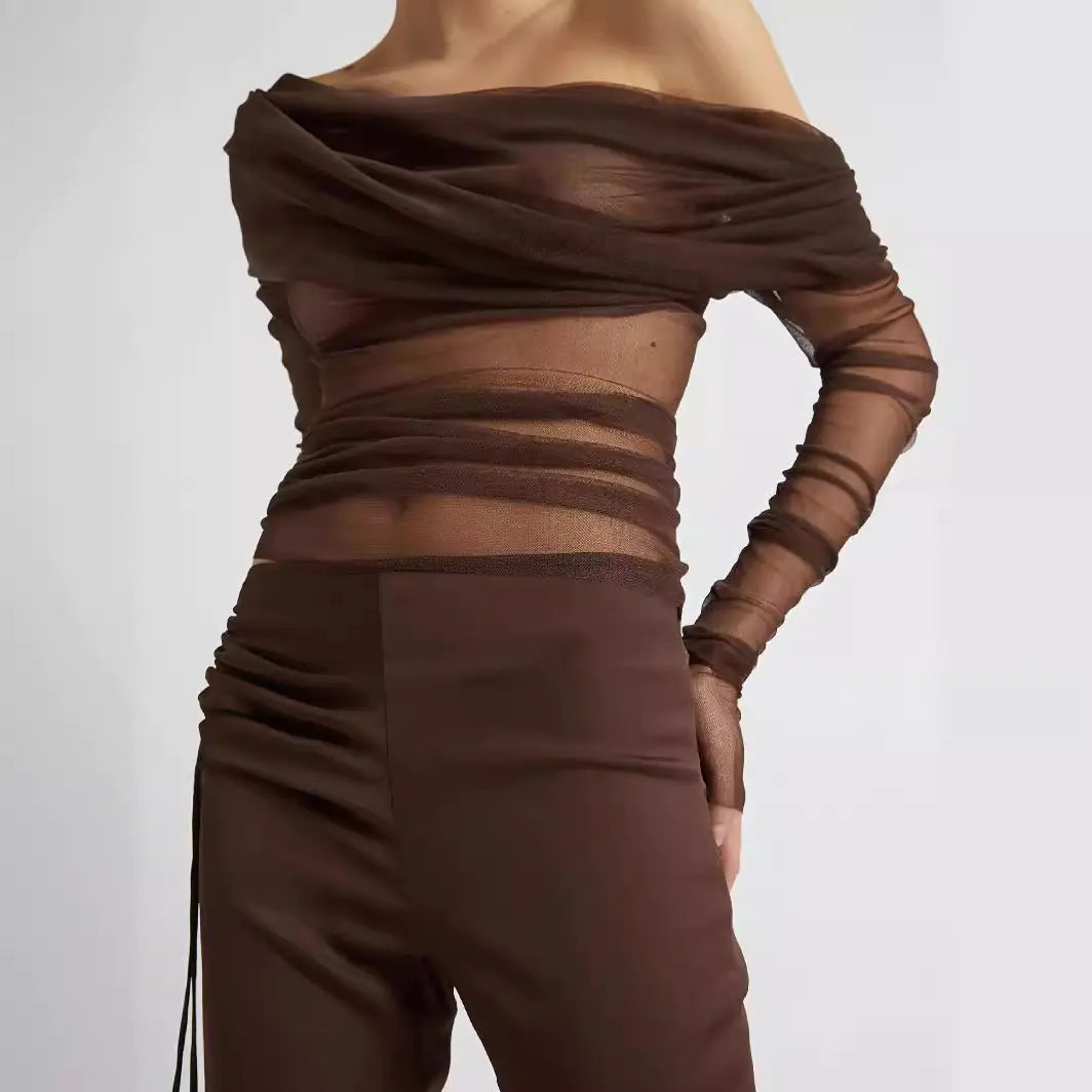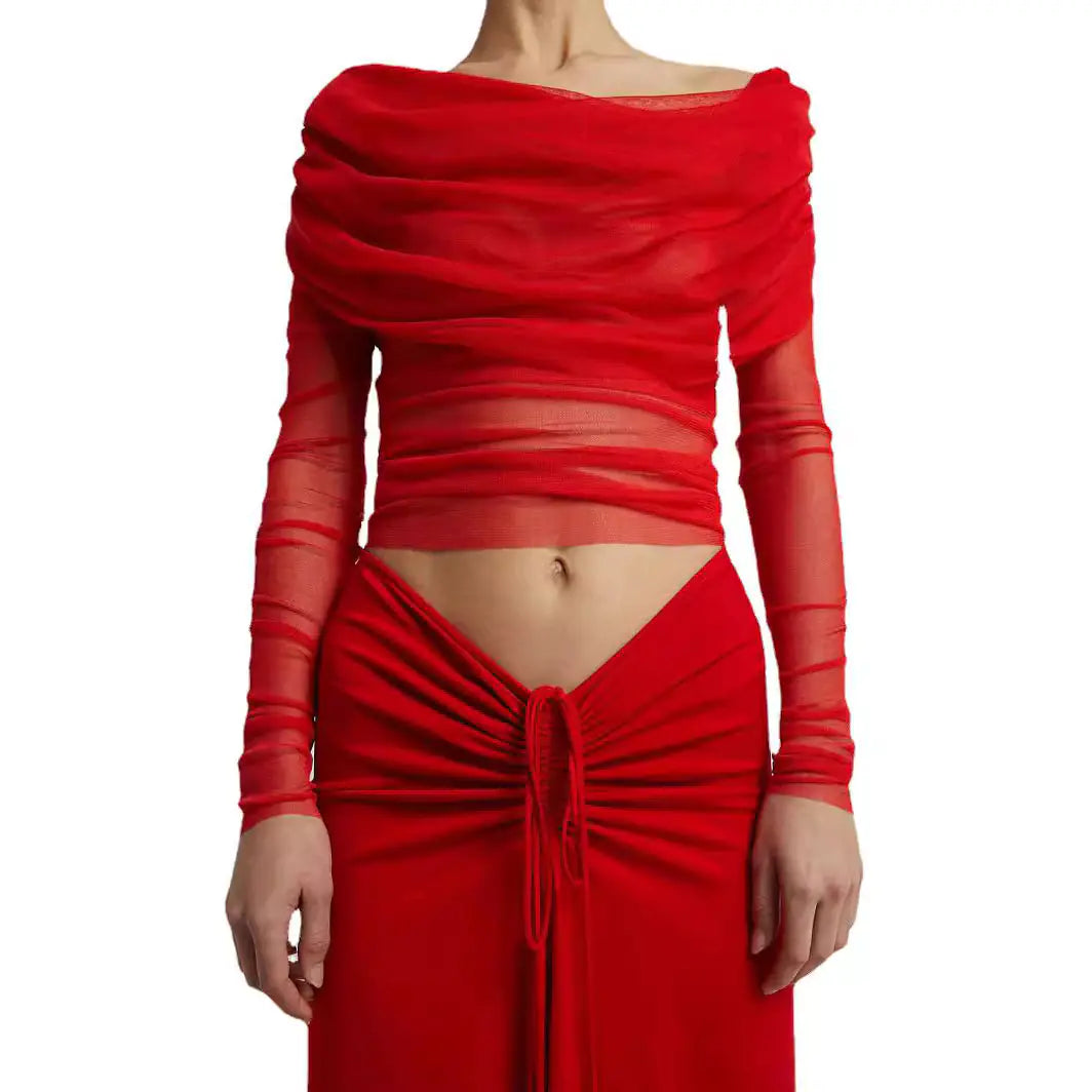 Breathtaking sheer mesh top with extra-long sleeves, off-shoulder neckline and sleek, spliced construction. Breathable polyester balances stretch and structure. In black, red, apricot or coffee; sizes S–L.