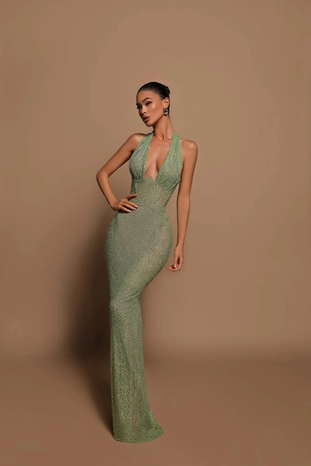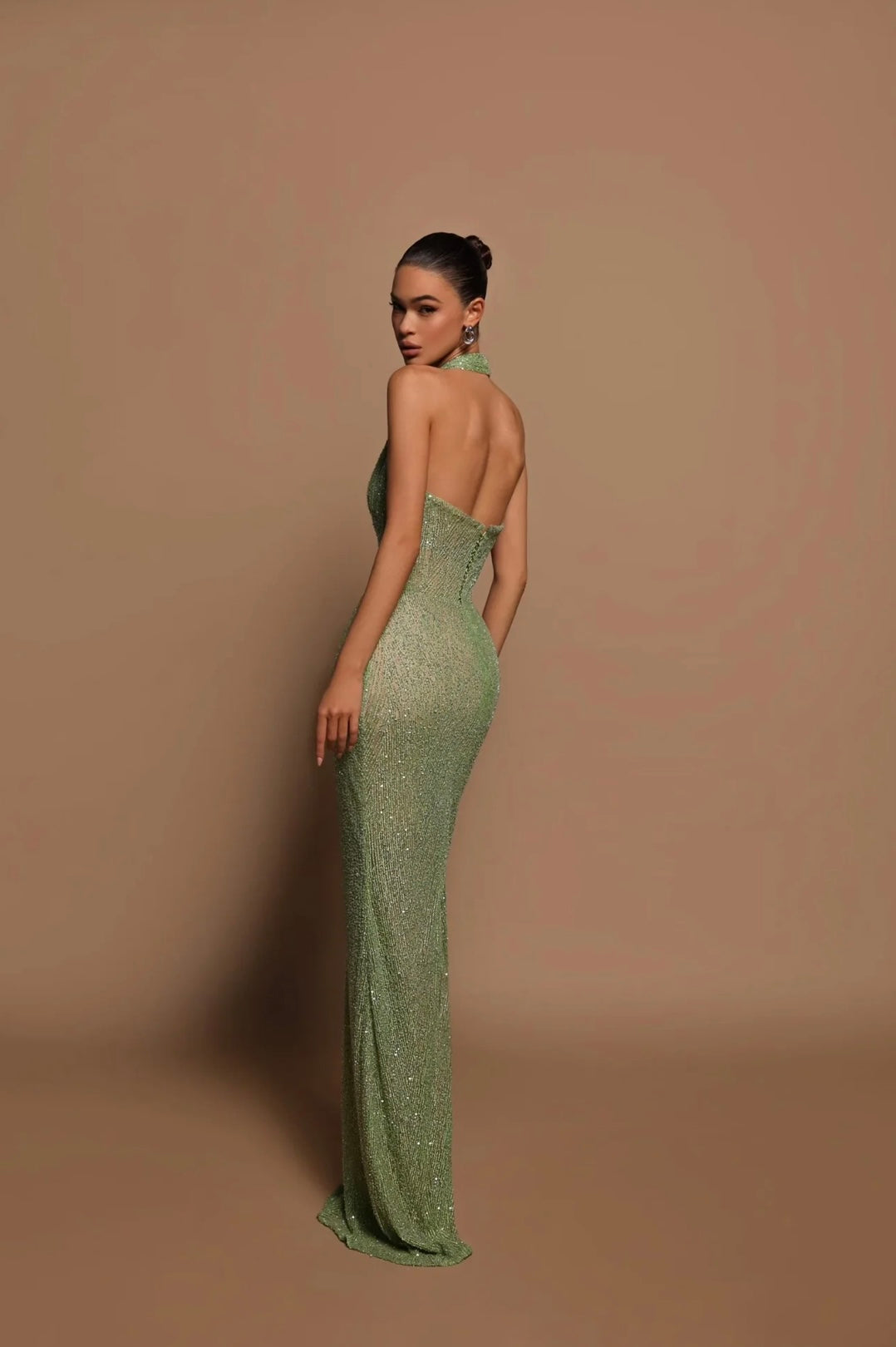 Captivate the room in this sequin evening gown with a deep V-neckline and side split. Crafted from premium polyester-spandex blend, it offers stretch, comfort, and a slimming fit. The light green hue and shimmering sequins radiate elegance, while the elastic waist ensures a flattering shape. Perfect for galas, weddings, and formal events where sophistication meets sparkle.